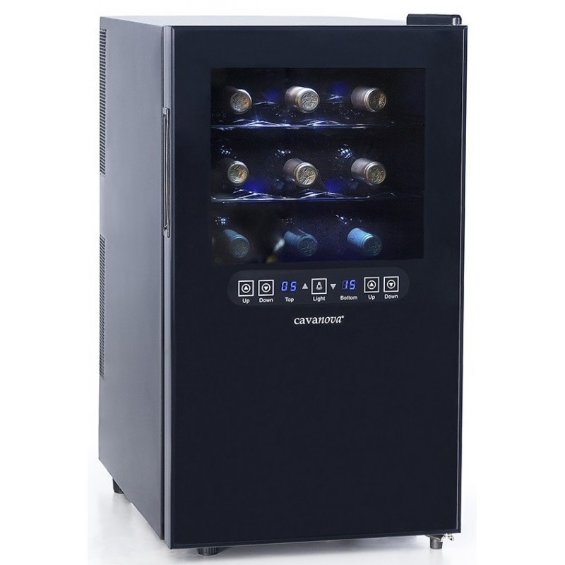 .-Vinoteca de conservación de 18 botellas .-Rango de temperaturas desde 12ºC a 18ºC y de 8ºC a 18ºC .-Sistema de refrigeración termoeléctrico .-Display de control de temperatura digital Iluminación interior suave .-Puerta con doble cámara de cristal .-Nuevo modelo .-Funcionamiento silencioso y sin vibraciones .-Eficiencia energética: Clase C .-4 bandejas de metal .-Dimensiones (cm): ancho 35,6 x fondo 50,5 x alto 65,5 .-2 años de garantía oficial Cavanova .-Incluye garantía oficial de 2 años y servicio postventa.